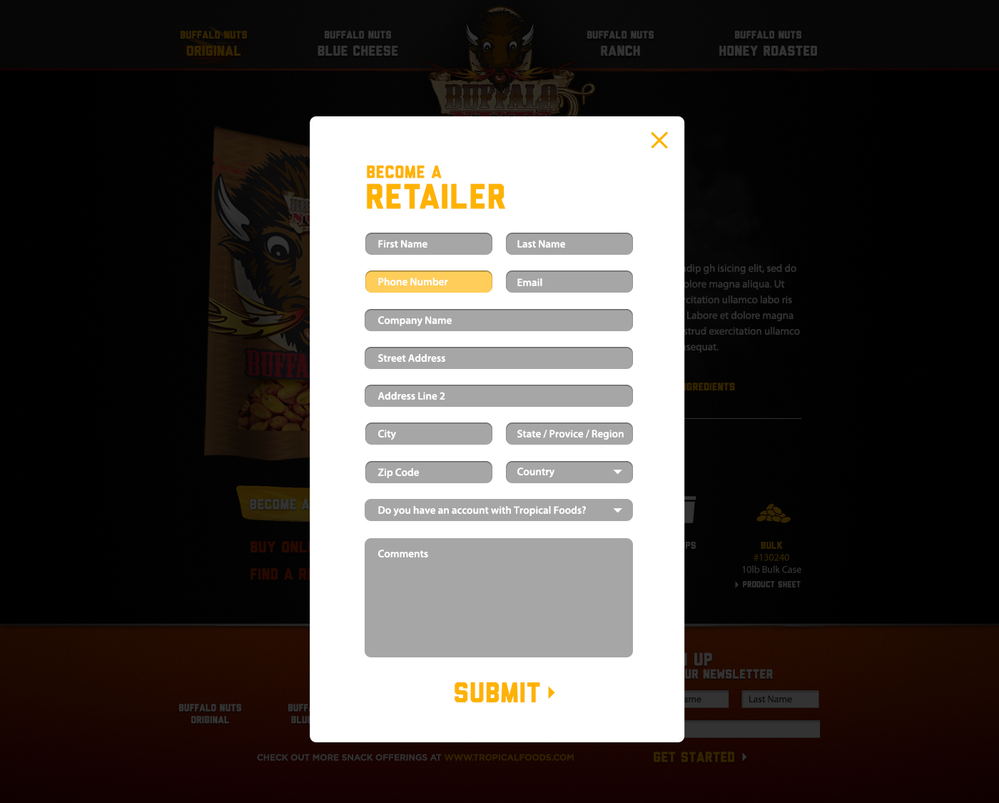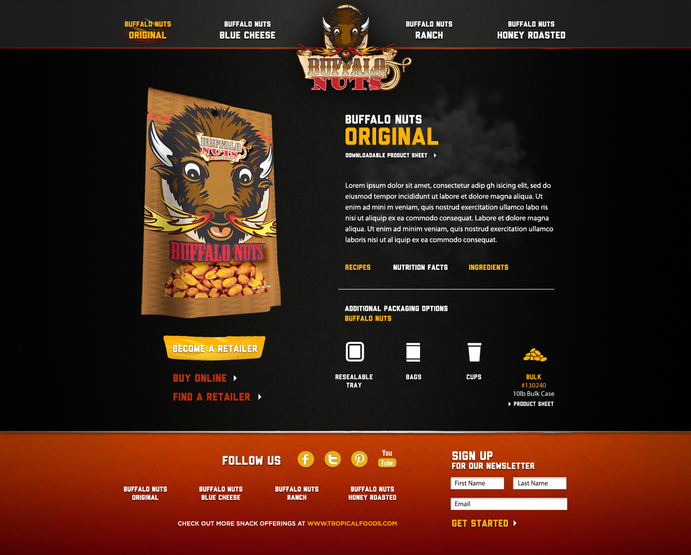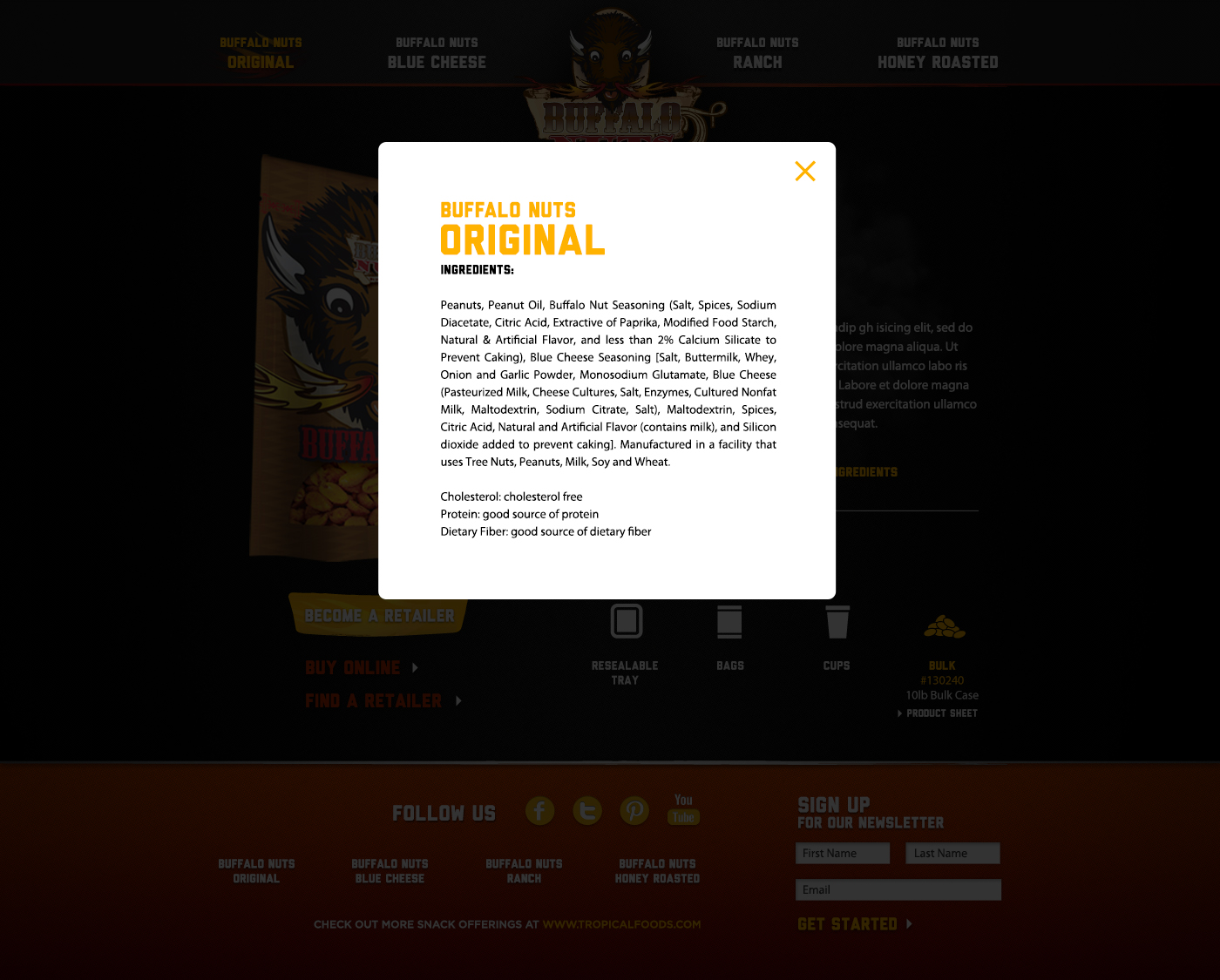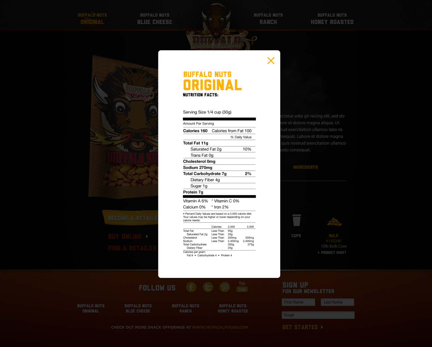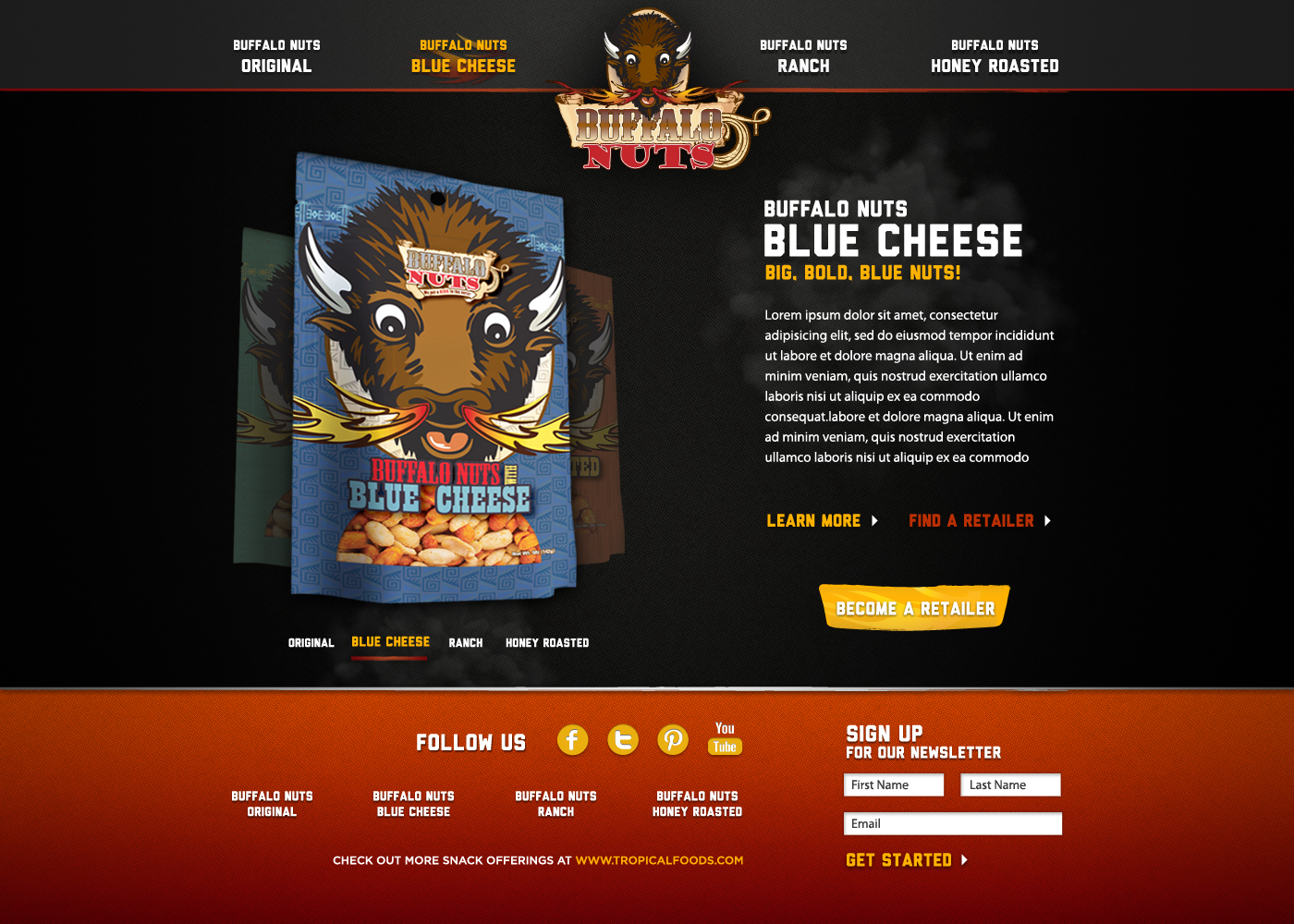 This was a microsite created to promote Tropical Nut's line of new spicy flavored peanuts. The goal was to boldly showcase each flavor and show how to order/find these products.